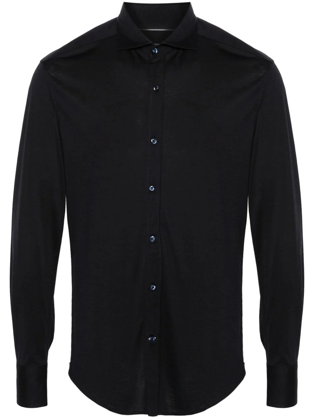 spread-collar jersey shirt Highlights - Navy blue - Silk-cotton blend - Jersey texture - Spread collar - Front button fastening - Long sleeves - Buttoned cuffs - Curved hem Made in Italy Composition Silk 62%, Cotton 38% SIZE & FIT Model measurements Height 6 ft 2 in(1.87 m) Bust/Chest 36.41 in(92.5 cm) Hips 35.43 in(90 cm) Waist 29.52 in(75 cm) FittingInformation Designed for a regular fit, allowing for a comfortably loose fit throughout the body Made from a midweight non-stretch fabric, this piece offers minimal elasticity when worn This piece fits true to size – take your usual size