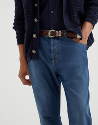 A traditional fabric for work, denim is enriched with Brunello Cucinelli’s refined yarns and workmanship in these classic five-pocket trousers with a leisure fit. Compact and durable, the cotton fabric is enhanced with the addition of silk and elastic fibers, creating a glossy, fluid and comfortable material. The leisure fit is defined by a comfortable, slightly loose cut in the seat, remaining close to the body down the leg. MATERIALS The pure cotton denim is characterized by a balanced weight that makes the style comfortable to wear. The garment-dyeing process gives the color an irregular appearance and creates slight shading along the garment’s seams and edges. DETAILS Metal button closure Front pockets with watch pocket Back patch pockets Plain hem Leisure fit: the rise and seat are soft and the proportions of the leg are tapered 74% COTTON, 24% SILK, 2% ELASTANE