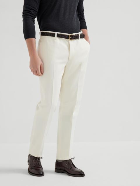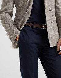 The lightness of gabardine enhances the casual, contemporary feel of these Italian fit trousers. Made from refined cotton and virgin wool yarns, the fabric is defined by its characteristic compact weave. The classic Italian fit is close-fitting and offers slightly softer lines than more traditional fits. MATERIALS The casual, versatile texture of gaberdine is made with cotton and virgin wool threads for a lightweight, compact effect. The knee-length lining provides added comfort. DETAILS Zip closure with button and inner-buttons Slanted front pockets with watch pocket Back welt pocket with button Lining to knee Plain hem Italian fit: the fit is fitted and balanced, with a regular seat and waist 63% COTTON, 37% VIRGIN WOOL