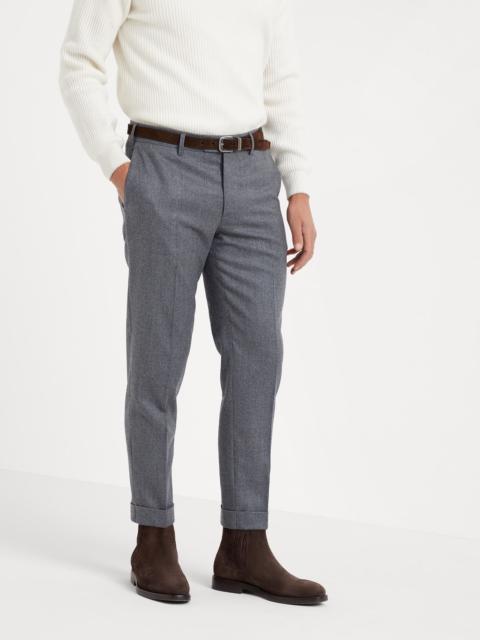 A classic tailored fabric, the pure virgin wool flannel enriches the versatile feel of these Italian fit trousers. The fit remains close to the body, but at the same time, offers slightly softer lines compared to more traditional fits. MATERIALS The noble qualities of natural virgin wool fibers accentuate the lightweight and soft touch of the flannel, whose twill weave displays the classic, diagonal texture. DETAILS Zip closure with button and inner-buttons Slanted front pockets Back welt pockets with button 17.5 cm (6,89") hem Italian fit: the fit is fitted and balanced, with a regular seat and waist 100% VIRGIN WOOL