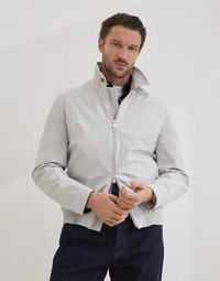 A menswear icon with a sporty, casual feel, the bomber jacket is reinterpreted in a technical way in this bonded nylon version, which is particularly suited for transitional periods. Lightweight and water-resistant, it enhances the classic straight, comfortable silhouette with sophisticated details such as a shirt-style collar with throat latch. MATERIALS Nylon is a lightweight fabric equipped with a thin inner membrane that improves weather-resistance without compromising breathability. A small percentage of elastic fiber provides the garment with added comfort. DETAILS Two-way zip closure Collar may be worn raised Hand pockets with snap Adjustable button cuffs Elasticized hem Cupro lining Two interior pockets with button closure and pen holder 88% NYLON, 12% ELASTANE