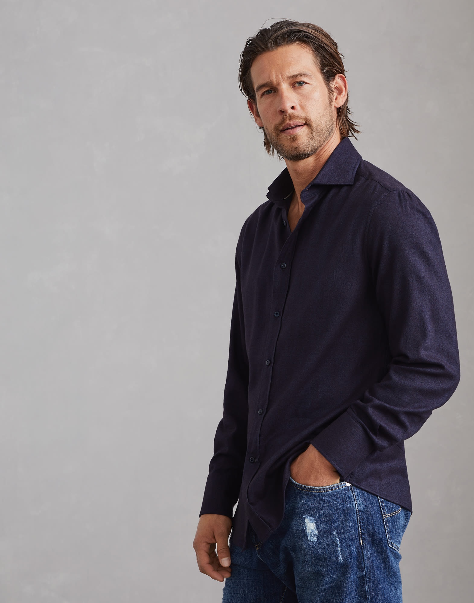 Skillful techniques and premium yarns enrich the casual and versatile lines of this stretch cotton shirt. The signature sartorial-inspired chevron texture blends together with the fabric's compact, supple feel, while the slim fit offers a streamlined silhouette through the chest and the shoulders. MATERIALS Precious natural fibers reproduce the classic chevron pattern with a modern and understated twist. The characteristics of flannel, soft and pleasant to the touch, ensure maximum comfort. The addition of synthetic fibers helps to create the perfect fit. DETAILS Placket closure with mother of pearl buttons Spread collar Cuffs have two mother of pearl buttons Slim fit 61% COTTON, 39% LYOCELL™