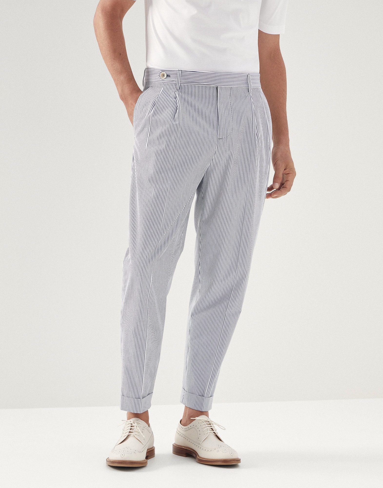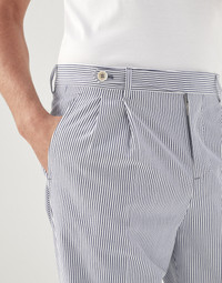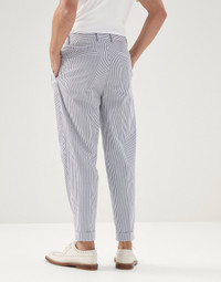 The casual summery feel of the striped pattern enriches the style of these easy-fit comfort cotton striped canvas pants with an informal note. The traditionally tailored details of the double pleats and the tabbed waistband are paired with the soft proportions of the easy fit, which offers a straight cut down the leg. MATERIALS Fresh and pleasing to wear, comfort cotton canvas is characterized by a classic striped motif presented in the seasonal nuances. DETAILS Zip closure with button and inner-buttons Slanted front pockets Double pleat Back welt pocket 18 cm hem Lining to knee Easy fit: the proportions are relaxed, with slightly lowered rise and seat. The lines of the leg are tapered 98% COTTON, 2% ELASTANE