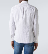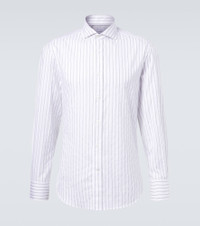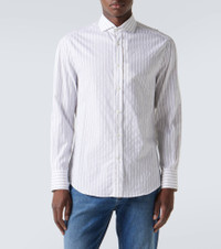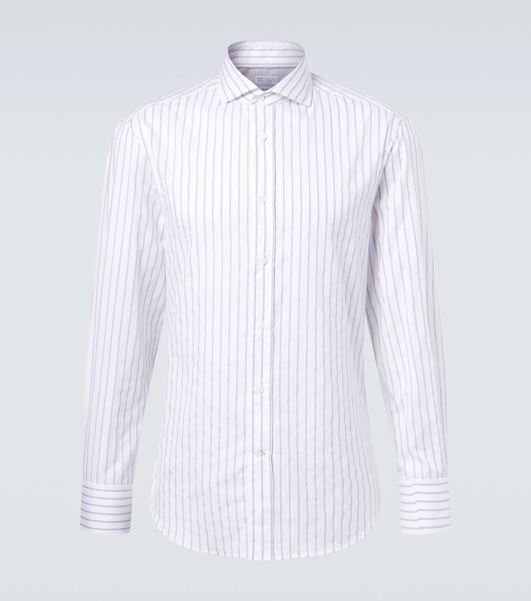 This striped shirt from Brunello Cucinelli is a blend of sophistication and quality. Crafted in Italy, this garment is cut from cotton poplin to a slim silhouette for both formal and more casual occasions. Product Details - Material: 100% cotton - Care instructions: machine wash at 30 degrees - Made in Italy - Designer color name: C026 - Item color: white - Contains non-textile parts of animal origin - Closure: buttoned front - Collar: classic (Straight point) - Cuff: two buttons - Item number: P01056034 Size & Fit - True to size - With pleats in the back - Slim fit - Non-stretchy fabric - Falls below the hip - Height of model is 189cm-74.5" and wears a size L
