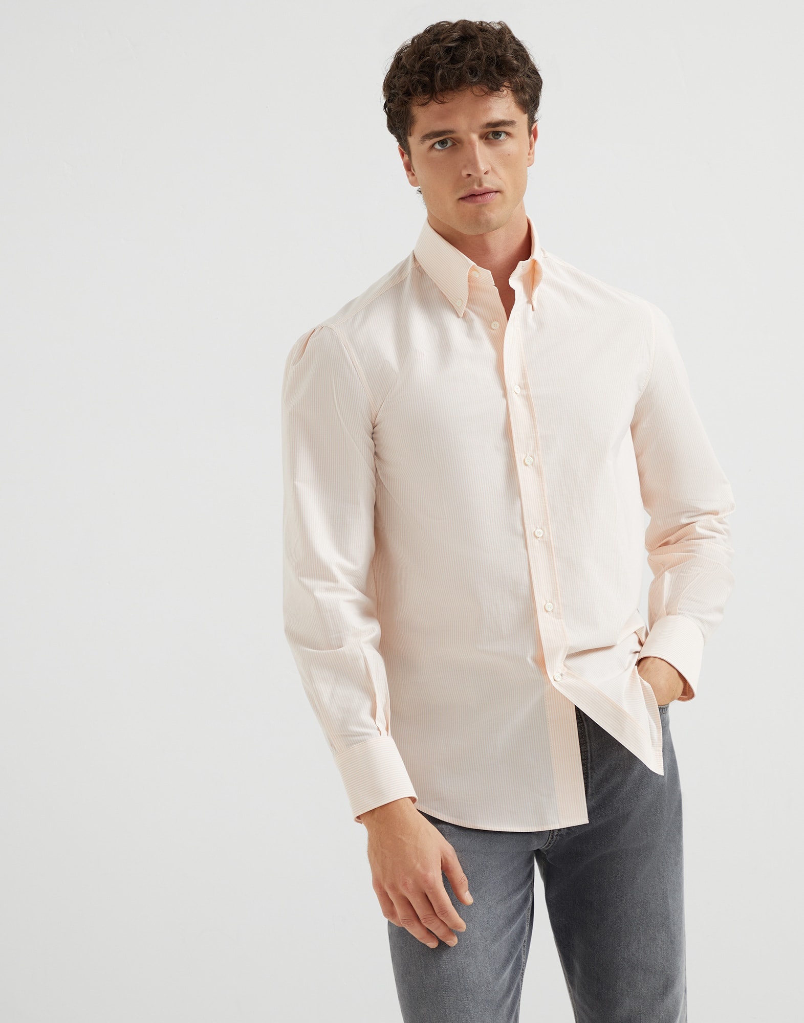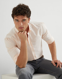 Refined natural fibers update and enrich the classic style of this basic fit shirt, an essential menswear piece. The pure cotton poplin is enhanced with a striped pattern in the season’s colors. The basic fit offers regular proportions that develop straight through the torso. MATERIALS A year-round classic menswear fabric, the lightweight and comfortable cotton poplin is delivered in a striped version that adds a touch of color in the hues of the season. DETAILS Placket closure with mother of pearl buttons Button-down collar Cuffs have two mother of pearl buttons Basic-fit 100% COTTON