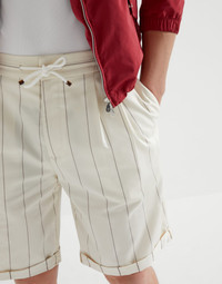 These gabardine Bermuda shorts combine refined, sartorial inspiration with the lightness of a fresh, contemporary style. The wool and Sea Island cotton fibers create a bright, soft fabric that highlights the lightly contrasting chalk stripe pattern with delicate precision. The fit is comfortable and classic at the same time, with a waist drawstring and double pleats. MATERIALS The fabric is made from strands of twisted wool combined with a prestigious and rare type of cotton: Sea Island. The cotton plant, grown solely in the Caribbean, develops long, soft and lustrous fibers thanks to the tropical climate: its limited production makes it extremely valuable. The chalk stripe pattern reflects sartorial tradition and elegance. DETAILS Zipper closure with metal hooks and drawstring Slanted front pockets Double pleat Back welt pockets Cuffed hem 52% WOOL, 48% COTTON