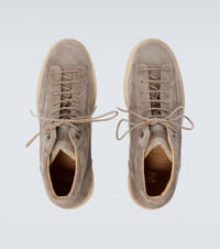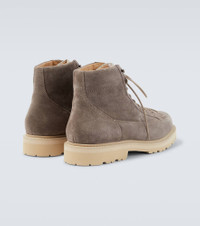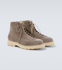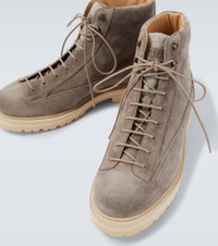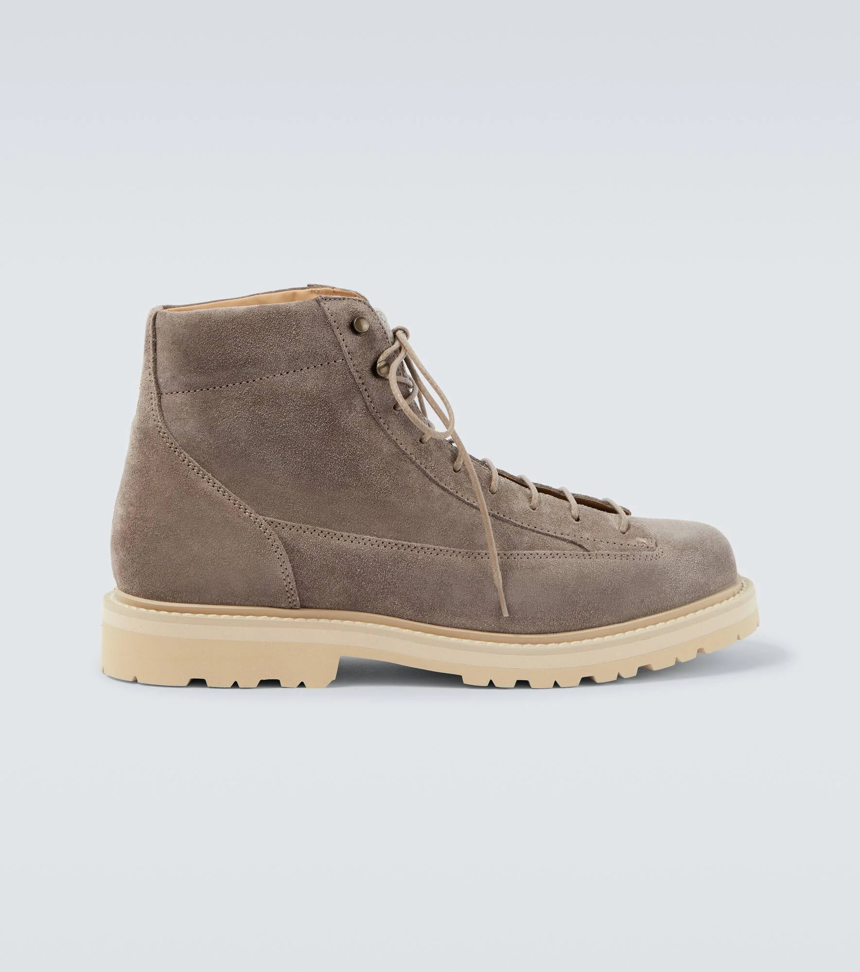 These ankle boots from Brunello Cucinelli combine an urban outdoor attitude with functionality and comfort. Crafted from velvety suede, this pair is detailed with tweed tongues made from silk, wool, and cashmere, lending a modern touch. Product Details - Upper: leather (suede) - Lining: leather - Sole: leather insole, rubber sole - Toe shape: round toe - Made in Italy - Includes: shoe box - Designer color name: Cdj30 - Item color: brown - Item number: P01056146 Size & Fit - True to size - European sizes