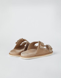The excellence of Brunello Cucinelli materials enriches the casual, summery style of these Urban Slides. The upper’s two soft washed suede straps are adjustable thanks to the metal buckles, personalized with an engraving of the logo. The leather insole is paired with a leather welt and an ultra lightweight rubber outsole. MATERIALS Manufacturing of the refined washed suede involves hand-buffing that enriches the velvety texture with slightly irregular coloring. The suede covered insole is paired with an ultra lightweight rubber bottom that provides added comfort. DETAILS Suede lining Sole in lightweight micro rubber Attached buckles REAL LEATHER