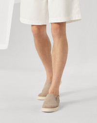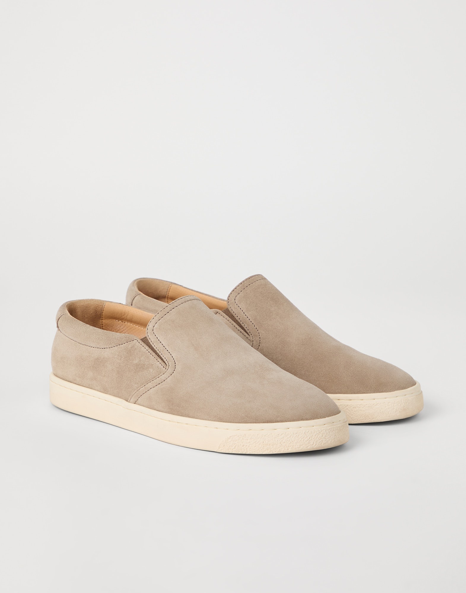 Brunello Cucinelli’s careful workmanship and refined materials enhance the versatile, informal feel of these slip-on sneakers, icons of casual style and comfort. Detailed in washed suede with a characteristic velvety hand and slightly irregular color, the upper is combined with a lightweight rubber bottom, ensuring a secure, comfortable fit. MATERIALS Manufacturing of the refined washed suede involves hand-buffing that enriches the velvety texture with slightly irregular coloring. An ultra lightweight rubber bottom provides added comfort. DETAILS Elastic side gussets Leather lining Natural rubber outsole TPU rubber tread REAL LEATHER