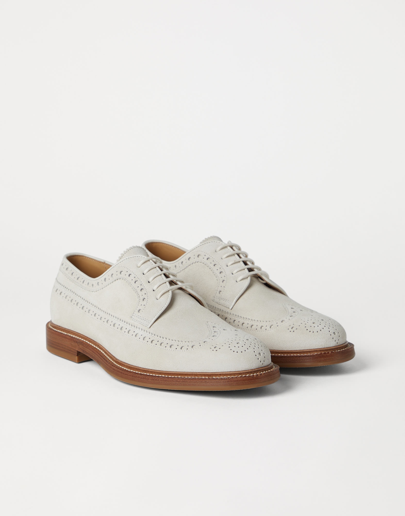 Contemporary and sophisticated at the same time, this Longwing Brogue derby perfectly interprets Brunello Cucinelli’s style. The suede’s velvety texture is paired with the classic perforation detail that extends along the entire upper. The welt with contrast stitching and the leather bottom complete the footwear’s tapered lines. MATERIALS Suede is a leather that offers a velvety, plush texture with a slightly shimmering look. The footwear is lined in soft leather. DETAILS Thin fabric laces Extra thin fabric laces Leather lining Leather sole TPU rubber tread REAL LEATHER