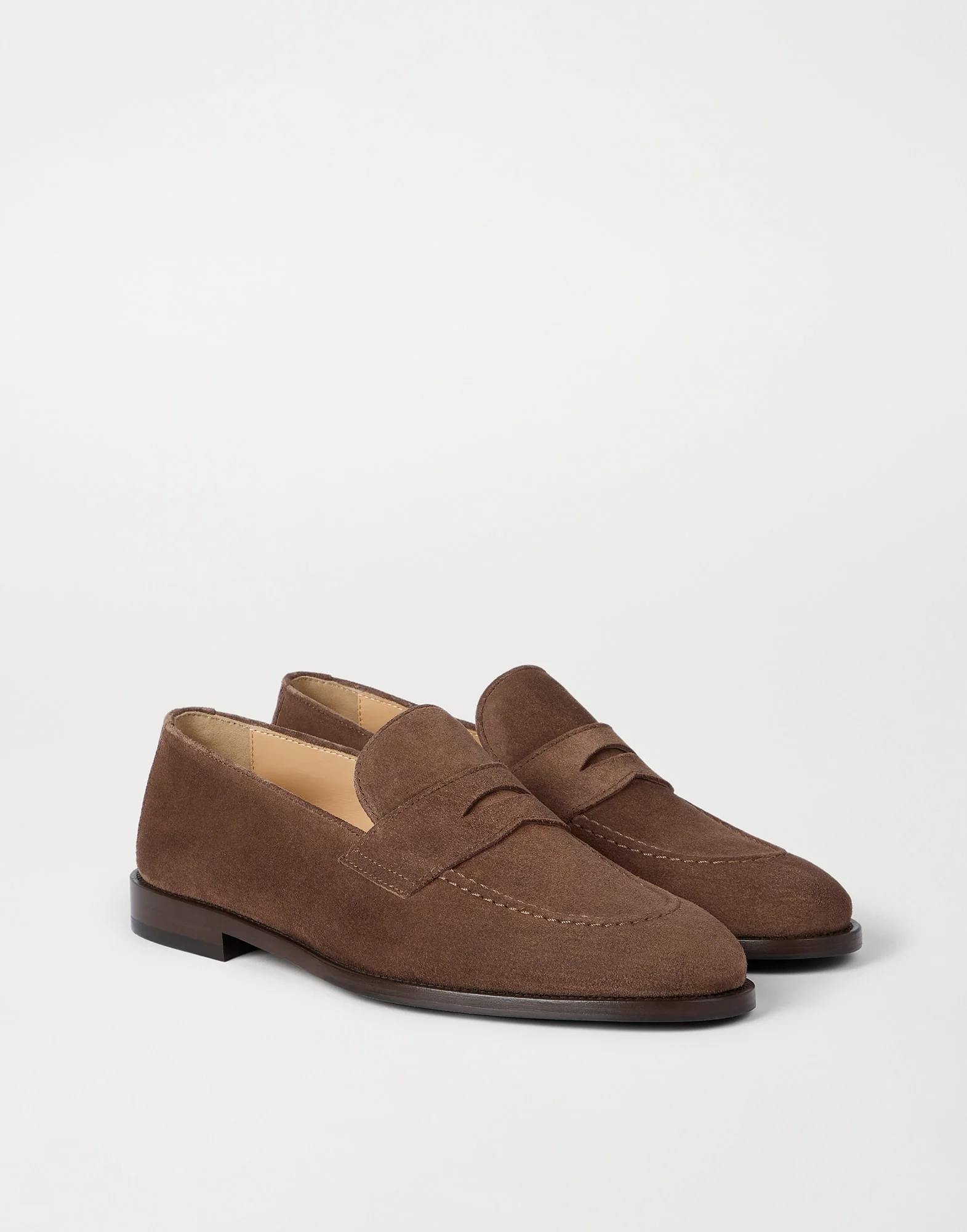 A timeless style of casual elegance, these penny loafers are enriched with refined Brunello Cucinelli materials. The velvety texture of suede enhances the informal look of the footwear, while its light, thin structure provides maximum comfort for the entire day. MATERIALS European suede is an exquisite, supple leather with an even and ultra-soft texture. A thin leather lining and leather sole complete the shoes. DETAILS Leather lining Leather sole TPU rubber tread 100% REAL LEATHER