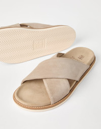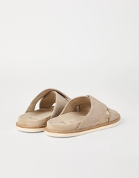 The excellence of Brunello Cucinelli materials enhances the informal style of these Cross-over slides, which are particularly versatile on warmer days. The crossing bands are detailed in soft washed suede, with a velvety, slightly irregular texture, while the TPU outsole ensures a secure, comfortable fit. MATERIALS Washed suede is finished to give the texture a pleasantly soft and slightly uneven look. The bottom takes advantage of the properties of TPU, an ultra lightweight and durable plastic material that provides added comfort. DETAILS Suede lining Rubber outsole TPU rubber tread REAL LEATHER