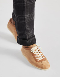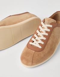 Enhanced by the excellence of Brunello Cucinelli materials and workmanship, these washed suede sneakers combine vintage inspiration in their slim, tapered silhouette. The velvety upper is enriched with slightly irregular color effects and is completed by the particularly thin rubber outsole, which guarantees lightness and comfort. MATERIALS Manufacturing of the refined washed suede involves hand-buffing that enriches the velvety texture with slightly irregular coloring. An ultra lightweight rubber bottom provides added comfort. DETAILS Flat fabric laces Leather lining Rubber outsole REAL LEATHER