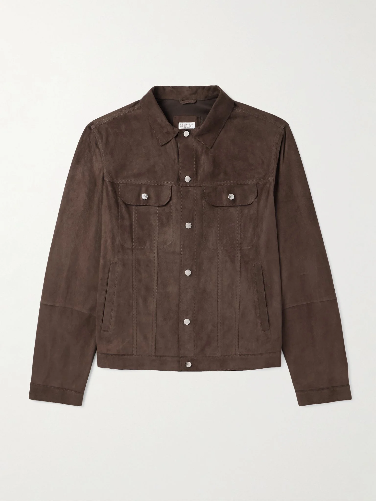 Brunello Cucinelli's jacket draws reference from utilitarian design codes. Crafted in Italy from supple suede, it has a trucker-inspired profile with two chest flap pockets. Zoom in on the silver-tone fastenings and you'll see that they're debossed with the label's crest. Size & Fit - Fits true to size. Take your normal size - Designed for a relaxed fit - Supple, slightly stretchy suede - Model is shown wearing a M - Model measures: chest 38"/ 96cm, height 6'1"/ 185cm Details & Care - Brown suede - Snap fastenings - 100% leather (Lamb) - Unlined - Dry clean