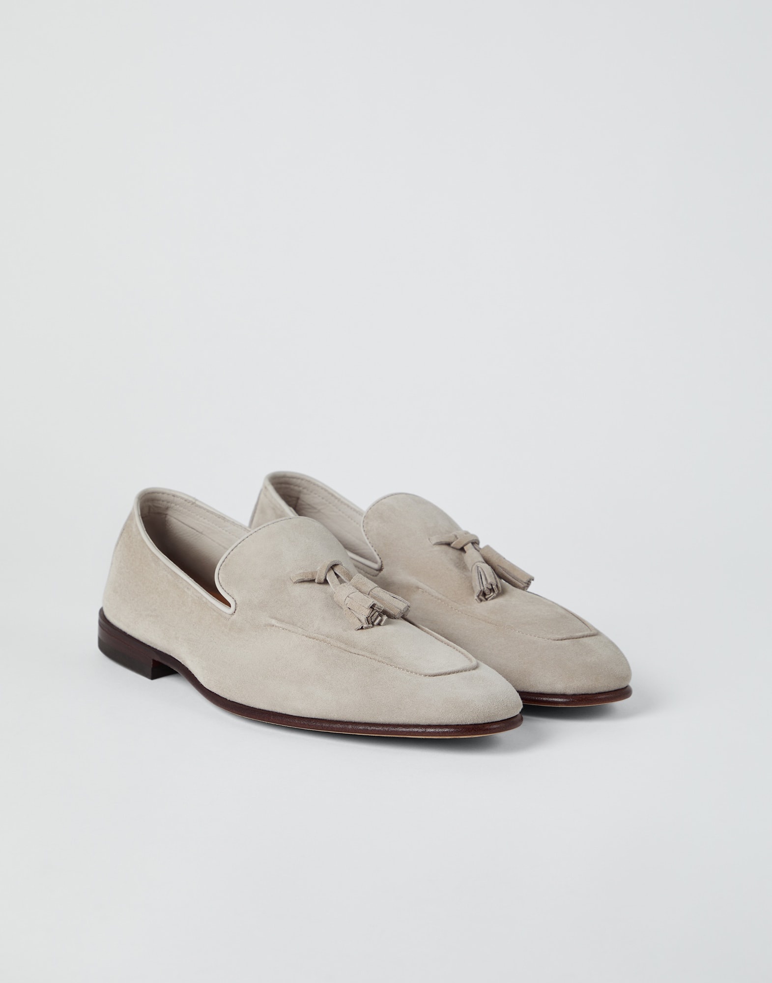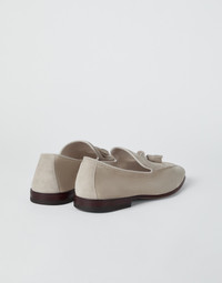 Refined Brunello Cucinelli materials enrich the look of these unlined loafers, a casual menswear style. The upper is detailed in luxurious suede, a fine leather with a velvety appearance. The tassel detail and raised stitching are paired with the thin leather outsole, perfectly balanced with the footwear’s streamlined shape. MATERIALS New suede features a very fine velvety texture, a characteristic that accentuates the surface’s shiny and shimmering effect. The leather lining completes the shoe. DETAILS Unlined Leather sole TPU rubber tread 100% REAL LEATHER