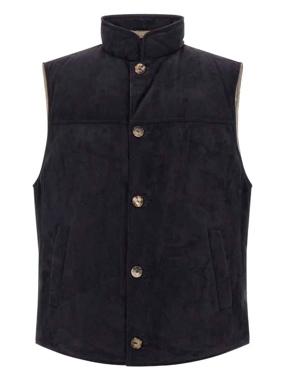 high-neck suede vest Highlights - Blue - High neck - Button closure - Welt pockets - Lamb suede Made in Italy Composition Outer: Lamb Suede 100% Washing instructions Read Manufacturer Guidelines