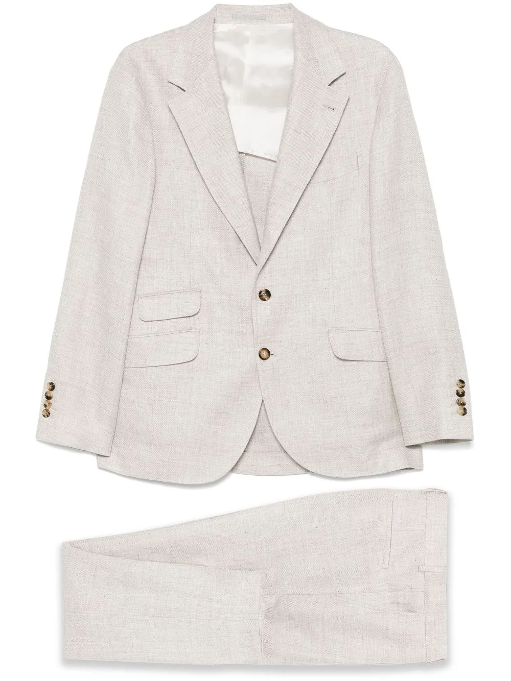 single-breasted suit Highlights - Almond beige - Front button fastening - Concealed fly and button fastening - Two side inset pockets - Two rear welt pockets Made in Italy Composition Outer: Linen/Flax 74%, Wool 24%, Silk 2% Lining: Cupro 100% SIZE & FIT Model measurements Height 6 ft 2 in(1.87 m) Bust/Chest 37.79 in(96 cm) Hips 37.79 in(96 cm) Waist 30.31 in(77 cm) FittingInformation Tailored for a slim fit, offering a comfortable fit that sits just away from the body The unfinished hems allow for the length to be altered Made from a midweight non-stretch fabric