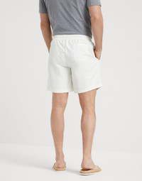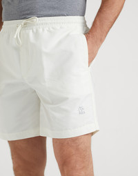 For travel or everyday lounging, this swimsuit is a must-have summer accessory. The season’s colors enhance the smooth, semi-matte lightweight nylon fabric. A waist drawstring and the pockets complete the style of the garment. The Solomeo logo detail adds a distinct touch. MATERIALS The synthetic fiber fabric is characterized by a smooth, slightly shimmering appearance. DETAILS Elastic waistband with drawstring Slanted front pockets Back pocket with hook-and-loop closure Swimsuit bag 100% POLYESTER