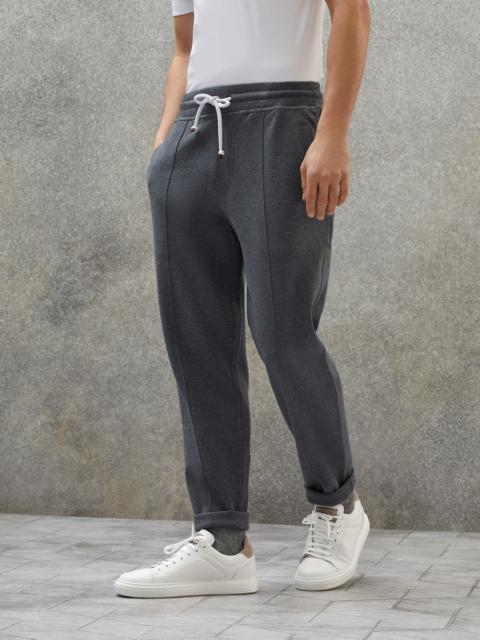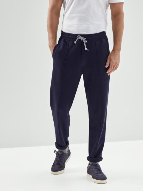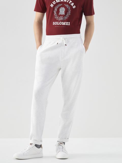 The excellence of Brunello Cucinelli materials enriches the Travelwear line, dedicated to moments of relaxation and free time. These techno cotton French terry trousers are characterized by the sporty detail of the elasticized drawstring waistband and the Crête, a tailored element that recreates the effect of a permanent crease in the center of the leg. MATERIALS Techno cotton French terry is a soft and lightweight fabric: the exterior texture is smooth and compact, while the interior offers a honeycomb structure which helps to make it comfortable when worn. A small percentage of synthetic fiber provides added comfort. DETAILS Rib knit waistband with drawstring Front pockets Back welt pockets with button Crête 93% COTTON, 7% NYLON