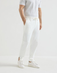 Refined materials enrich the sporty style of the Travelwear line, dedicated to moments of relaxation and leisure. These trousers with an elasticized waist and drawstring showcase a soft, relaxed silhouette and are delivered in techno cotton French terry, enriched by its distinctive texture contrast: smooth and compact on the outside and soft on the inside against the skin. Completed by the Crete detail on the front and the ankle zippers, the design features regular volume that makes it comfortable and versatile. MATERIALS Techno cotton French terry is a soft, lightweight fabric: the exterior texture is smooth and compact, while the reverse side offers a honeycomb structure which helps to make it lightweight to wear. A small percentage of synthetic fiber provides added comfort. DETAILS Rib knit waistband with drawstring Slanted front pockets Crete Back welt pockets with button Rib knit hem with zipper 95% COTTON, 5% NYLON