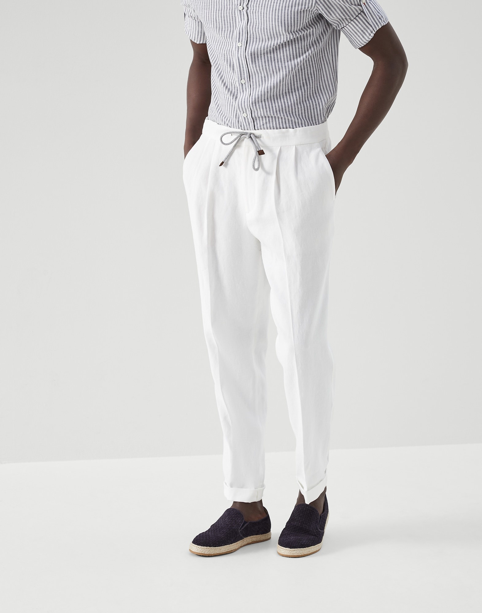 The fresh, slightly slubbed appearance of twisted linen enriches these leisure fit trousers with a light, effortless effect. The drawstring and the double pleats create a harmonious contrast of style, while the modern proportions of the leisure fit offer a soft cut in the seat with close-fitting lines down the leg. MATERIALS The pure linen fabric uses very twisted threads to achieve a texture that combines the natural fiber’s characteristic dry and slightly irregular hand with a compact look inspired by classic tailored fabrics. DETAILS Zipper closure with metal hook, inner-button and drawstring Slanted front pockets Back welt pockets Leisure fit: the rise and seat are soft and the proportions of the leg are tapered 18 cm hem 100% LINEN