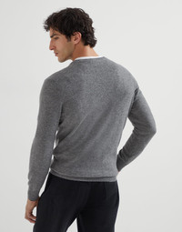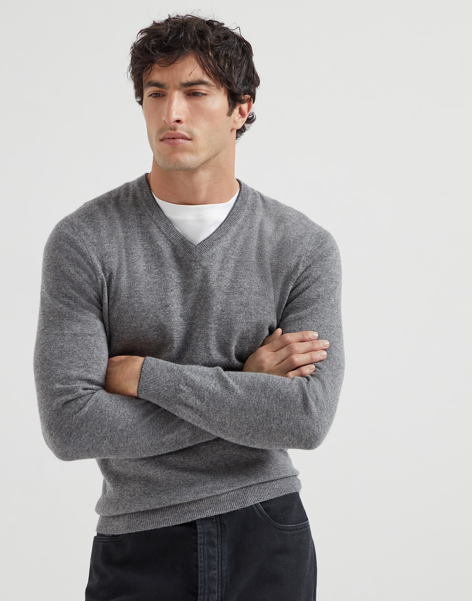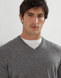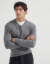 Precious cashmere fiber enhances the long sleeve sweater, a four-season men's wardrobe piece. A narrow, contrasting color trim on the cuff and collar edges adds a refined detail to the garment which offers a regular, close-fitting shape. MATERIALS The noble cashmere fiber is characterized by an extreme fineness and also for its precious insulating qualities which guarantee warmth, providing coverage and lightness when worn. DETAILS Rib knit V-neck Rib knit cuffs and bottom band Plain stitch 100% CASHMERE