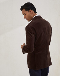 Classic inspiration and contemporary creativity define the refined feel of this one-and-a-half-breasted deconstructed blazer with patch pockets and metal buttons. The fabric’s unmistakable texture comes to life through intense colors and the natural qualities of comfort cotton and cashmere fibers, for an ideal fit. The “Solomeo Shoulder”, named after the hamlet where the company is located, characterizes the Brunello Cucinelli blazer with signature proportions. The tapered and pronounced cut of the shoulder enhances the male physique without the need for padding. MATERIALS Refined cashmere fibers enhance the traditional texture of cotton corduroy, accentuating its softness, warmth and sheen. The presence of an elastic fiber ensures maximum comfort. The lightweight cupro lining enriches and completes the garment. DETAILS 6 metal button closure Peak lapel Patch pockets, ticket pocket and chest pocket Cuffs have four metal buttons and functional buttonholes Cupro half lining Two interior pockets with button closure and pen holder Double back vent Drop 7 91% COTTON, 8% CASHMERE, 1% ELASTANE