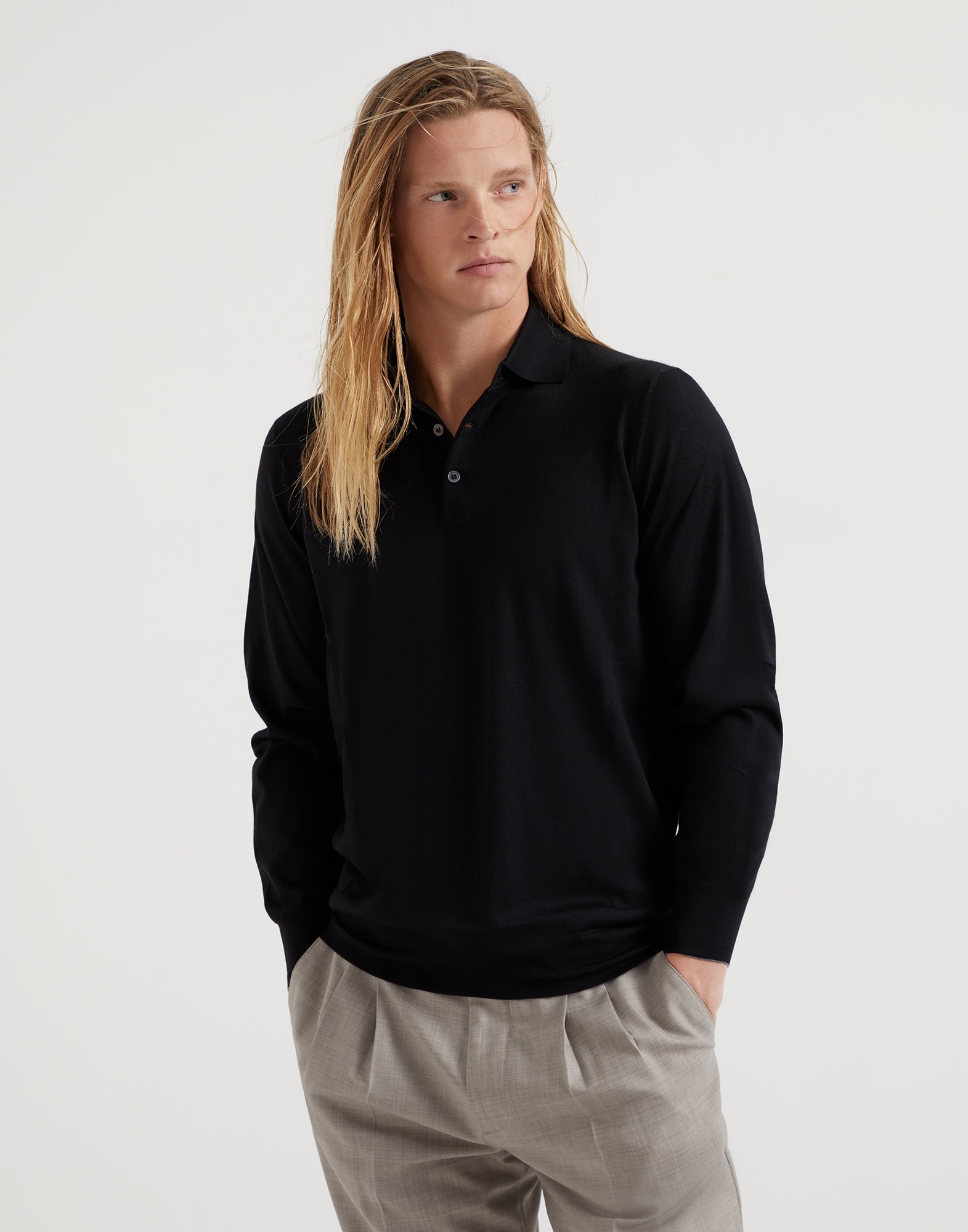 The quality of Brunello Cucinelli knitwear is expressed in the essential and refined style of this lightweight polo made from virgin wool and cashmere. The combination of the unique properties of these fibers gives the garment a moderate weight, making it perfect for mild days and transitional periods. The fit offers regular volumes, with the classic shirt collar. MATERIALS The manufacturing of the virgin wool and cashmere yarn brings out the noble qualities of the natural fibers to provide a lightweight and cozy feeling when worn. DETAILS Shirt-style collar with button opening Plain stitch 90% VIRGIN WOOL, 10% CASHMERE