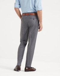 Refined Brunello Cucinelli materials enrich the classic flavor of these virgin wool chalk stripe twill trousers. Regular proportions in the seat and along the leg are offered by the comfortable fit. MATERIALS The classic chalk stripe pattern is enhanced by the refined qualities of virgin wool. DETAILS Zip closure with double button and backing button Slanted front pockets Back welt pockets with button 18.5 cm (7,28") hem Formal fit: the fit is characterized by regular proportions in the seat and straight lines down the leg 100% VIRGIN WOOL
