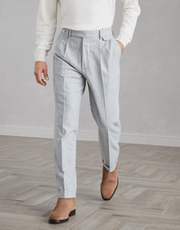 Classic and versatile virgin wool flannel pairs perfectly with the sartorial style of these double pleated pants with tabbed waistband. Soft proportions in the seat and close-fitting lines down the leg characterize the leisure fit. MATERIALS The slightly uneven effect of the nuance is spread throughout the texture of the wool flannel, a compact, lightweight fabric that expresses perfectly the qualities of the fine natural fiber. DETAILS Zip closure with button and inner-buttons Slanted front pockets Double pleat Back welt pockets with flap and button 18 cm (7,09") hem Leisure fit: the rise and seat are soft and the proportions of the leg are tapered 100% VIRGIN WOOL