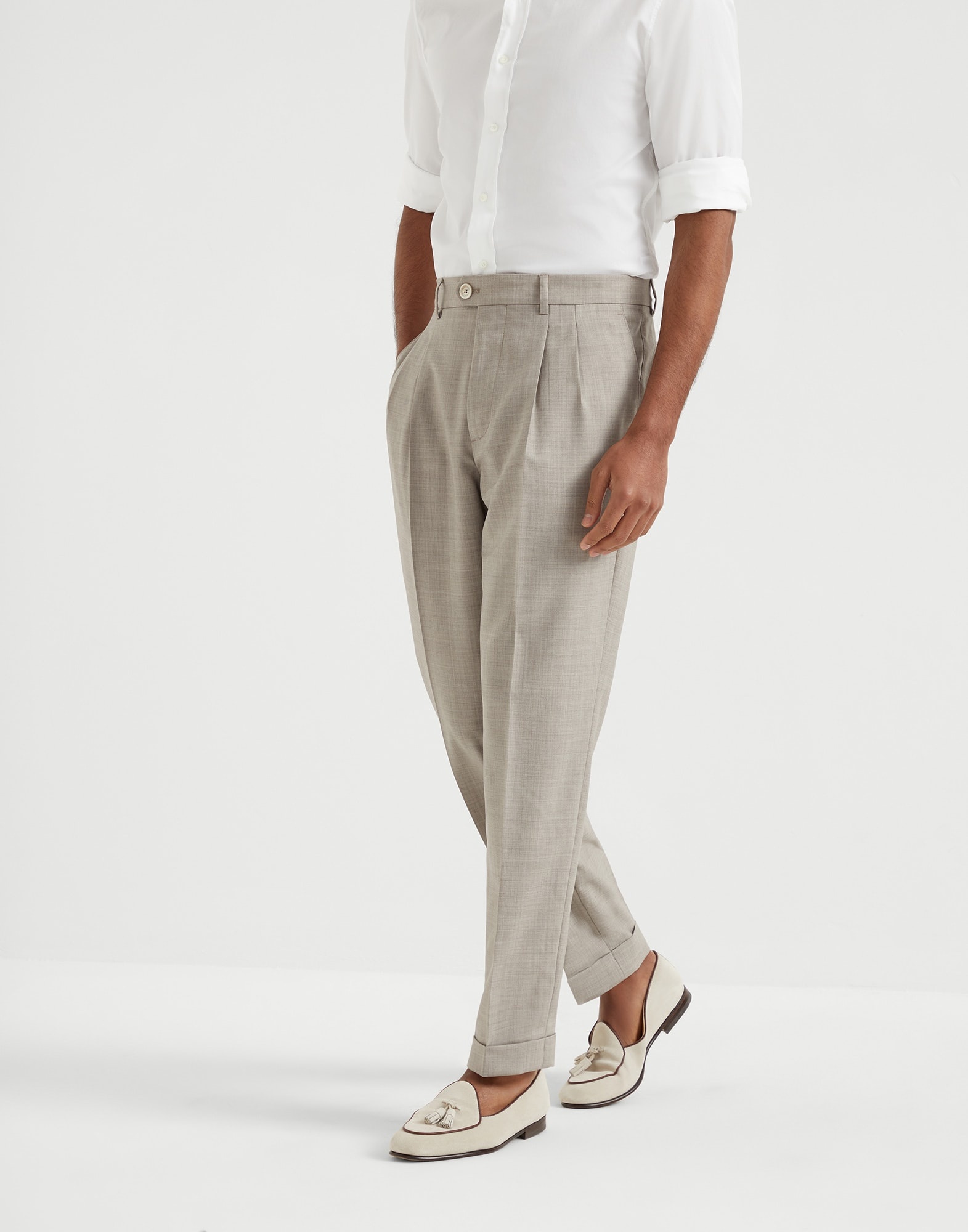 The elegant touch of virgin wool defines the classic style of these trousers. Traditional details such as double pleats are paired with the casual feel of the cuffed hem and the rear flap pockets with horn buttons. The leisure fit offers soft proportions in the seat and a slight low-rise, while the cut remains close to the body down the leg. MATERIALS The texture of the fabric displays a slightly uneven color that reveals the slight lines of the weave. A very fine virgin wool structure gives the fabric a compactness and lightness, offering maximum comfort when worn. DETAILS Zip closure with button, metal hook and backing button Slanted front pockets Double pleat Back welt pockets Cuffed hem Leisure fit: the rise and seat are soft and the proportions of the leg are tapered 100% VIRGIN WOOL