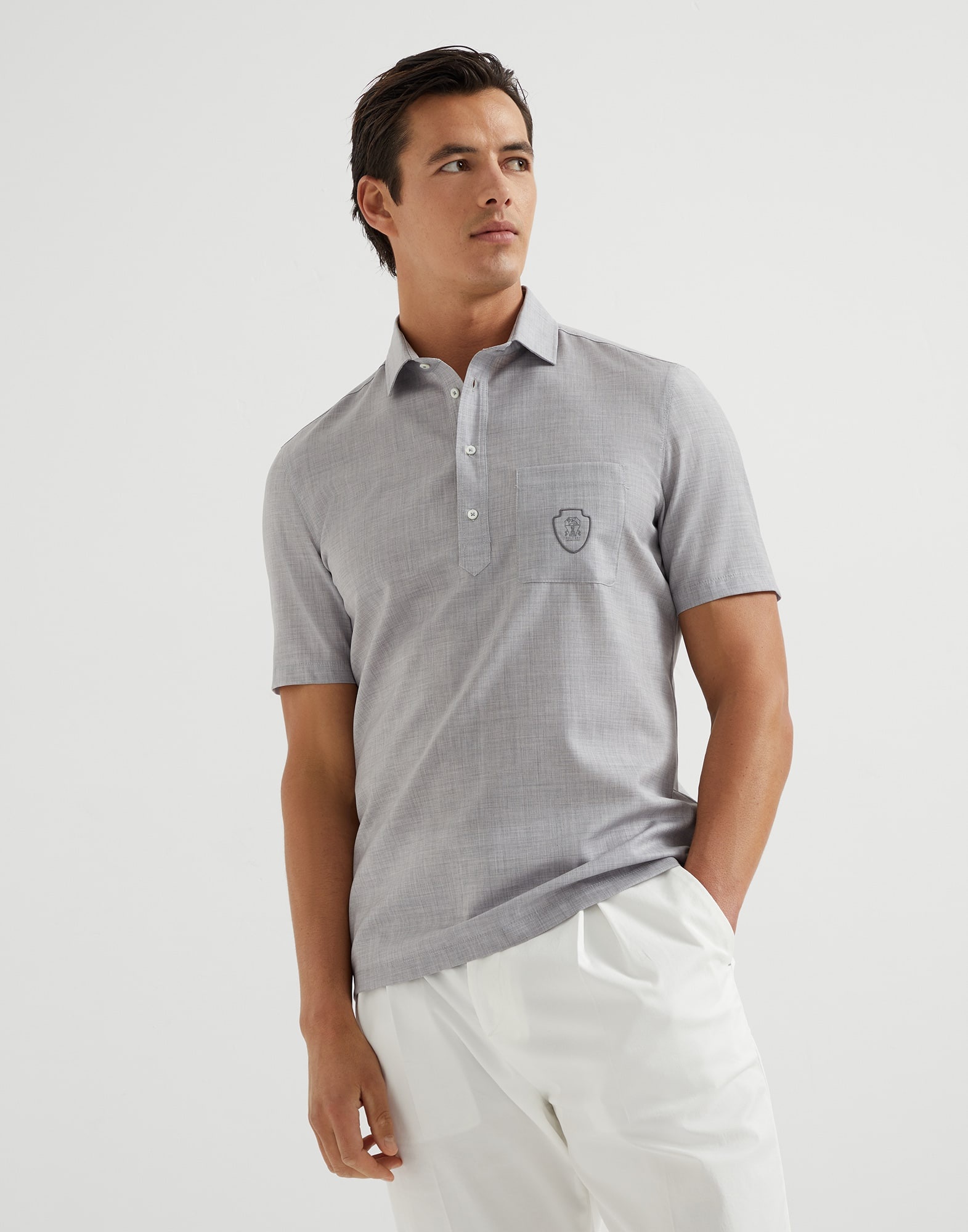 The excellence of Brunello Cucinelli materials is paired with the natural sophistication of the world of Golf in this virgin wool poplin polo. The particular characteristics of the natural fibers provide the garment with a slightly uneven texture, comfort and lightness. The classic polo silhouette is completed by the chest pocket and the distinctive touch of the heraldic logo. MATERIALS A classic menswear fabric, the poplin is delivered in a new pure virgin wool version featuring very fine yarns and a distinct texture. The material achieved is compact and lightweight, providing maximum comfort, with a slightly irregular appearance that enhances the season’s colors. DETAILS Shirt-style collar with button opening Sleeves with flat pressed hem Patch chest pocket Flat pressed hem 100% VIRGIN WOOL