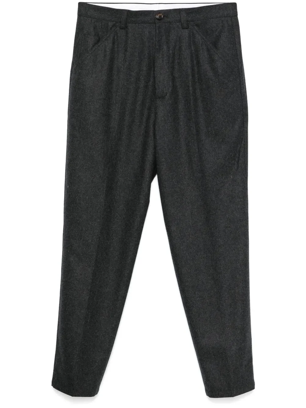 THESE ANTHRACITE GREY VIRGIN WOOL TROUSERS OFFER A SLEEK AND SOPHISTICATED LOOK. THE FLANNEL MELANGE EFFECT ADDS A TOUCH OF TEXTURE, WHILE THE CONCEALED FLY AND BUTTON FASTENING PROVIDE A CLEAN AND STREAMLINED APPEARANCE. THE MID-RISE WAIST AND BELT LOOPS OFFER COMFORT AND FLEXIBILITY, MAKING THESE TROUSERS PERFECT FOR ANY OCCASION. WITH PRESSED CREASES, TWO SIDE SLASH POCKETS, A COIN POCKET, AND TWO REAR WELT POCKETS, THESE TROUSERS ARE PRACTICAL AND STYLISH. THE STRAIGHT LEG DESIGN COMPLETES THE TIMELESS SILHOUETTE.