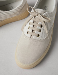 These sneakers combine a classic, tapered and essential design with refined materials and craftsmanship. The washed suede provides a distinct character and personality thanks to its velvety hand and irregular color, creating a balanced visual contrast with the Techno cotton corduroy. The rubber outsole ensures comfort. MATERIALS The upper combines materials with different textures: the manufacturing of the refined washed suede includes a hand-buffing process that enriches the velvety texture with slightly irregular coloring. The high-performance techno cotton is ribbed for a striped effect. The rubber outsole provides added comfort. DETAILS Flat fabric laces Extra fabric laces Leather lining Rubber outsole REAL LEATHER