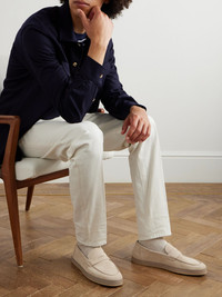 The beauty of the penny loafer is twofold - it’s one of the simplest shoes to wear and perhaps the easiest to style. Brunello Cucinelli's pair has been made in Italy from washed-suede and features covered midsoles for a more streamlined look. Rubber-crepe soles provide plenty of traction. Size & Fit - Fits true to size. Take your normal size - European sizing Details & Care - Light-grey washed-suede (Calf)