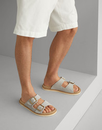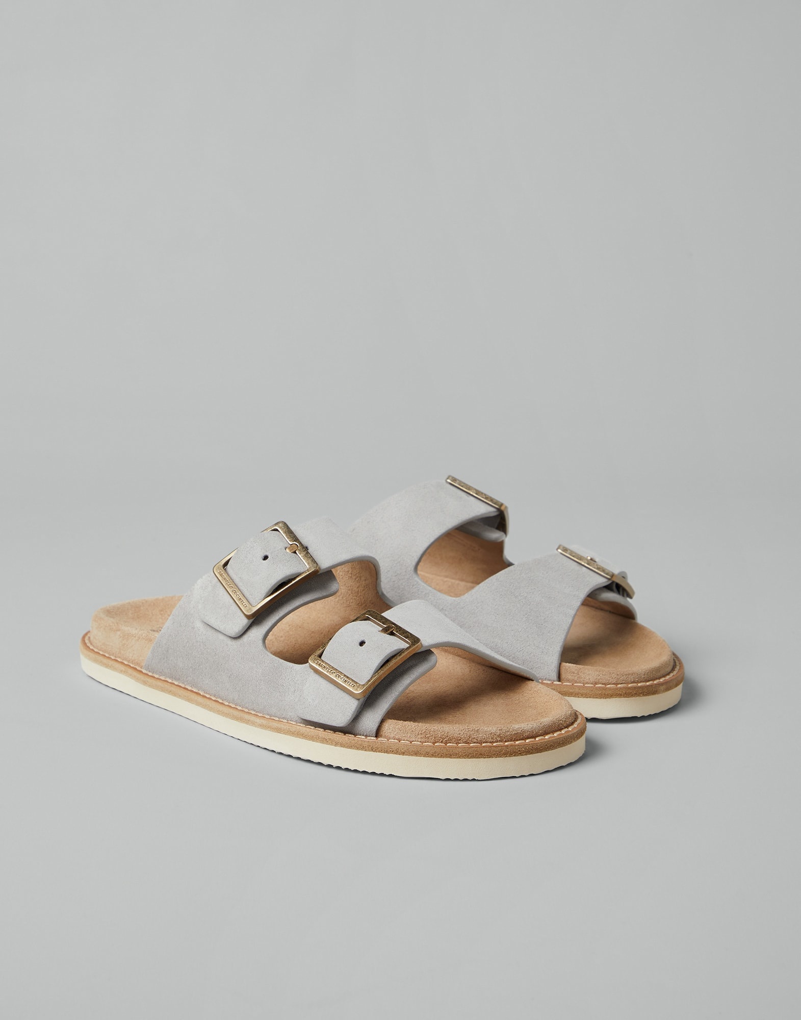 The excellence of Brunello Cucinelli materials enriches the casual, summery style of these Urban Slides. The upper’s two soft washed suede straps are adjustable thanks to the metal buckles, personalized with an engraving of the logo. The leather insole is paired with a leather welt and an ultra lightweight rubber outsole. MATERIALS Manufacturing of the refined washed suede involves hand-buffing that enriches the velvety texture with slightly irregular coloring. The suede covered insole is paired with an ultra lightweight rubber bottom that provides added comfort. DETAILS Suede lining Sole in lightweight micro rubber Attached buckles REAL LEATHER