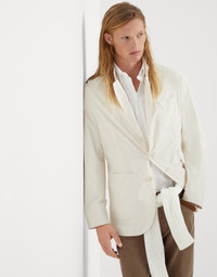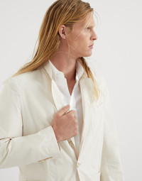 Refined materials meet sartorial-inspired shapes and seasonal details for a sophisticated take on warm weather outerwear. Lightweight water-resistant microfiber features a fluid drape and a shimmering effect that enriches the classic lines. On the inside, contrast color heat bonded inner seams add a contemporary touch. MATERIALS A refined Japanese fabric, microfiber uses a polyamide thread wrapped in another made of polyester. A special process gives the surface a slight shimmering effect and a velvety texture, which is very fluid and pleasant to touch. Lastly, a finish helps to protect the fabric from light water contact. DETAILS Horn button closure Lapel collar Unlined Upper patch pocket Patch hand pockets Cuffs have four horn buttons Double back vent 70% POLYESTER, 30% NYLON