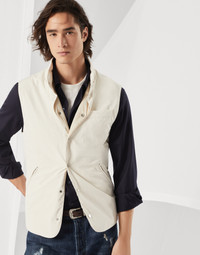 Modern, innovative materials provide function and performance to this water-resistant microfiber vest with detachable hood. The garment incorporates the classic codes of casual outerwear, with a throat latch, snap closure and side pockets. The surface of the fabric is smooth and silky, while the lightweight Thermore® padding on the inside offers warmth and protection. MATERIALS A refined Japanese fabric, microfiber is crafted from a polyamide core wrapped in strands of polyester. Special processing gives the surface subtle shimmer, a velvety texture and also makes the fabric very fluid and pleasant to touch. Lastly, a finish is added to help protect the fabric from light water contact. DETAILS Snap closure Stand-up collar Detachable drawcord hood with lining Hand pockets with zipper Two interior pockets with button and pen holder Lined Thermore® padding 70% POLYESTER, 30% NYLON