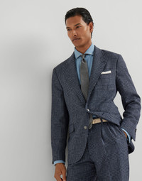 An elegant silhouette and refined yarns add distinctive elegance to this Prince of Wales deconstructed blazer with large peak lapels and metal buttons. The classic tailored pattern comes to life thanks to a distinctive nuanced and irregular effect created by the light blend of wool, alpaca and silk. The “Solomeo Shoulder”, named after the hamlet where the company is located, characterizes the Brunello Cucinelli blazer with signature proportions. The tapered and pronounced cut of the shoulder enhances the male physique without the need for padding. MATERIALS Exceptionally long and airy, the alpaca fibers infuse the warm, luminous wool and silk blend with a touch of lightness and a distinctive nuanced effect that enhances the tailored Prince of Wales pattern. The ultra-lightweight cupro lining provides the garment with added comfort. DETAILS 3-roll-2 closure with metal buttons Large peak lapel Welt pockets with flap, ticket pocket and chest pocket Cuffs have four horn buttons and functional buttonholes Cupro half lining Two interior pockets with button closure and pen holder Double back vent Drop 7 41% WOOL, 40% ALPACA, 19% SILK