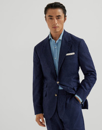 The skillful combination of refined yarns and textile tradition elevate the contemporary feel and the deconstructed silhouette of this Cavallo blazer with angled flap pockets. The sophisticated color stands out thanks to the distinctive weave of the wool and cashmere grisaille, a light, comfortable fabric enriched by the slightly mottled effect of the flecked yarn. The “Solomeo Shoulder”, named after the hamlet where the company is located, characterizes the Brunello Cucinelli blazer with signature proportions. The tapered and pronounced cut of the shoulder enhances the male physique without the need for padding. MATERIALS The alternating grisaille threads enrich the season’s colors thanks to the special mottled effect of the flecked yarn, while the wool and cashmere fibers provide the fabric with exceptional warmth and lightness. The cupro lining provides the garment with added comfort. DETAILS 3-roll-2 closure with horn buttons Notched lapel Welt pockets with flap, ticket pocket with flap and chest pocket Cuffs have four horn buttons and functional buttonholes Cupro half lining Two interior pockets with button closure and pen holder Double back vent Drop 7 95% WOOL, 5% CASHMERE