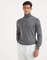 The quality of Brunello Cucinelli materials enriches the classic lines of the lightweight turtleneck sweater. Contrasting color details on the cuff edges adds a sophisticated element to the garment style that is characterized by a regular fit with a close-fitting shape. MATERIALS Single-ply manufacturing of the cashmere and silk yarn brings out the qualities of the natural fibers and provides lightness and comfort. The garment takes on a balanced weight which is very pleasant to wear. DETAILS High turned-down collar in rib knit Rib knit cuffs and bottom band Plain stitch 70% CASHMERE, 30% SILK