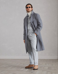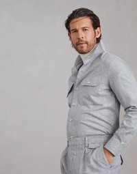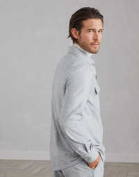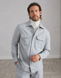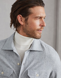 Inspired in shape and proportions by shirt-like outerwear, this new overshirt pairs an informal attitude and refined materials for a mix of elegant style. The lightness of the virgin wool flannel enhances the garment’s unconstructed design. The chest pockets add a touch of utility wear inspiration. MATERIALS The soft, lightweight pure wool flannel enhances the noble qualities of the natural fiber, while the twill weave showcases the fabric’s diagonal texture. DETAILS Horn button closure Shirt-style collar Unlined Upper pockets with flap and button Button cuffs Single back vent with buttons 100% VIRGIN WOOL
