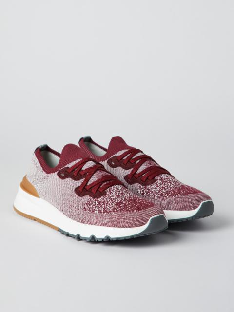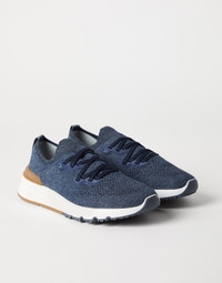 The classic yarns of Brunello Cucinelli knitwear inspire the elegant, sporty feel of these sneakers. The upper is made of a very lightweight, stretch chine knit, which showcases a compact appearance on the sides with "micro-perforations" on the toe, a detail characteristic of sporty accessories. The elasticity of the knit guarantees an optimal fit and comfort. MATERIALS The cotton knit combines natural and synthetic fibers as well as a small percentage of spandex to provide optimal comfort. Its unlined construction and EVA bottom offer lightness. DETAILS Flat fabric laces Unlined Sole in lightweight micro rubber Detachable insole 89% COTTON, 10% NYLON, 1% ELASTANE