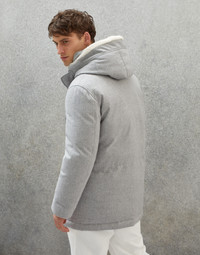 Refined Brunello Cucinelli materials elevate the casual, versatile feel of this parka in wool, silk and cashmere bonded diagonal twill. The fabric’s elegant texture enhances the season’s color with a subtle speckled effect, while the shearling-lined hood introduces a contrasting detail and showcases the wool’s characteristic full texture. The classic double pockets and the warm high-quality down and feather fill provide added comfort and protection. MATERIALS Manufacturing of the wool, silk and cashmere diagonal twill creates a slightly irregular texture reminiscent of traditional tailored fabrics. The addition of a thin bonded layer enhances protection from the elements without compromising breathability. All of the goose down and feather fill used comes exclusively from European suppliers who are members of the European Down and Feather Association (EDFA), guaranteeing the welfare of animals and the environment. DETAILS Double closure with zip and buttons Lined hood Upper zip pockets Patch hand pockets with flap and button Rib knit cuffs Water-resistant nylon lining Two interior pockets with button and pen holder Padding made from high-quality natural materials: 90% goose down, 10% goose feathers 89% WOOL, 6% SILK, 5% CASHMERE
