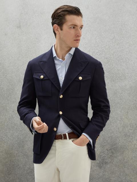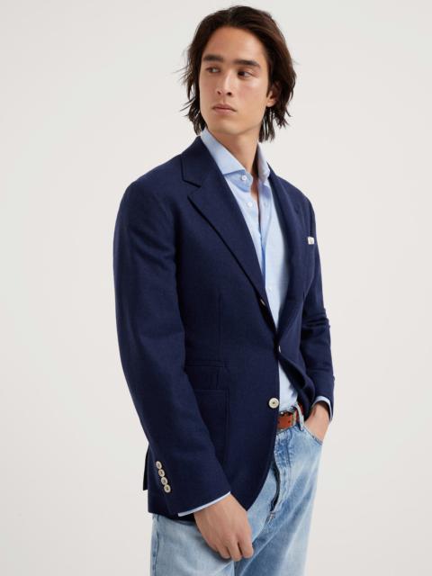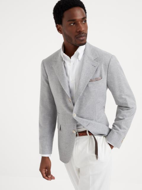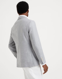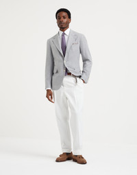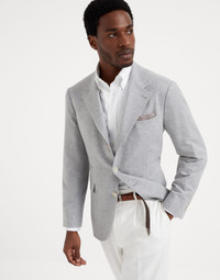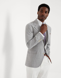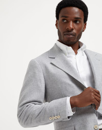 The irregular texture of fine wool, silk and cashmere diagonal twill is combined with the sartorial and versatile style of this deconstructed blazer complemented by classic flap pockets. The “Solomeo Shoulder”, named after the hamlet where the company is located, characterizes the Brunello Cucinelli blazer with distinct proportions. The tapered and pronounced cut of the shoulder enhances the male physique without the need for padding. MATERIALS Manufacturing of the wool, silk and cashmere diagonal twill creates a slightly irregular texture that brings to mind the tailored flair of traditional fabrics. A Cupro half lining provides added comfort. DETAILS 3-roll-2 closure with horn buttons Notched lapel Welt pockets with flap, ticket pocket and patch chest pocket Cuffs have four horn buttons and functional buttonholes Double back vent Cupro half lining Two interior pockets with button closure and pen holder Drop 7 89% WOOL, 6% SILK, 5% CASHMERE