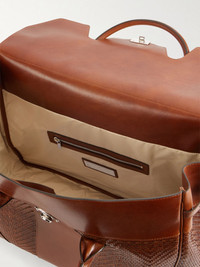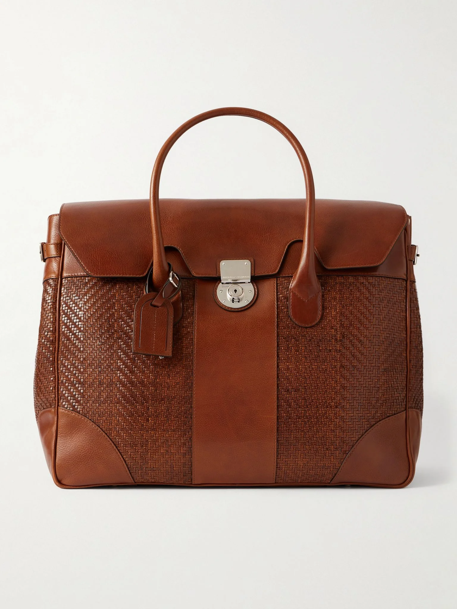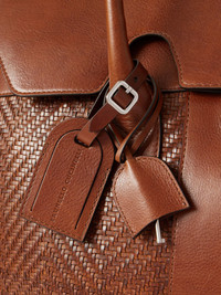 An unwavering commitment to quality materials and Italian craftsmanship ensures that Brunello Cucinelli's accessories will stand the test of time. This weekend bag has been made in Italy from panels of smooth and woven leather that'll age nicely and is detailed with a luggage tag. Stow a change or two of clothes and your laptop inside. Details & Care - Material: leather - Lining: fabric - Internal details: internal zipped pocket, internal slot pocket - Closure: lock-and-key fastening - Top handles - Colour: brown