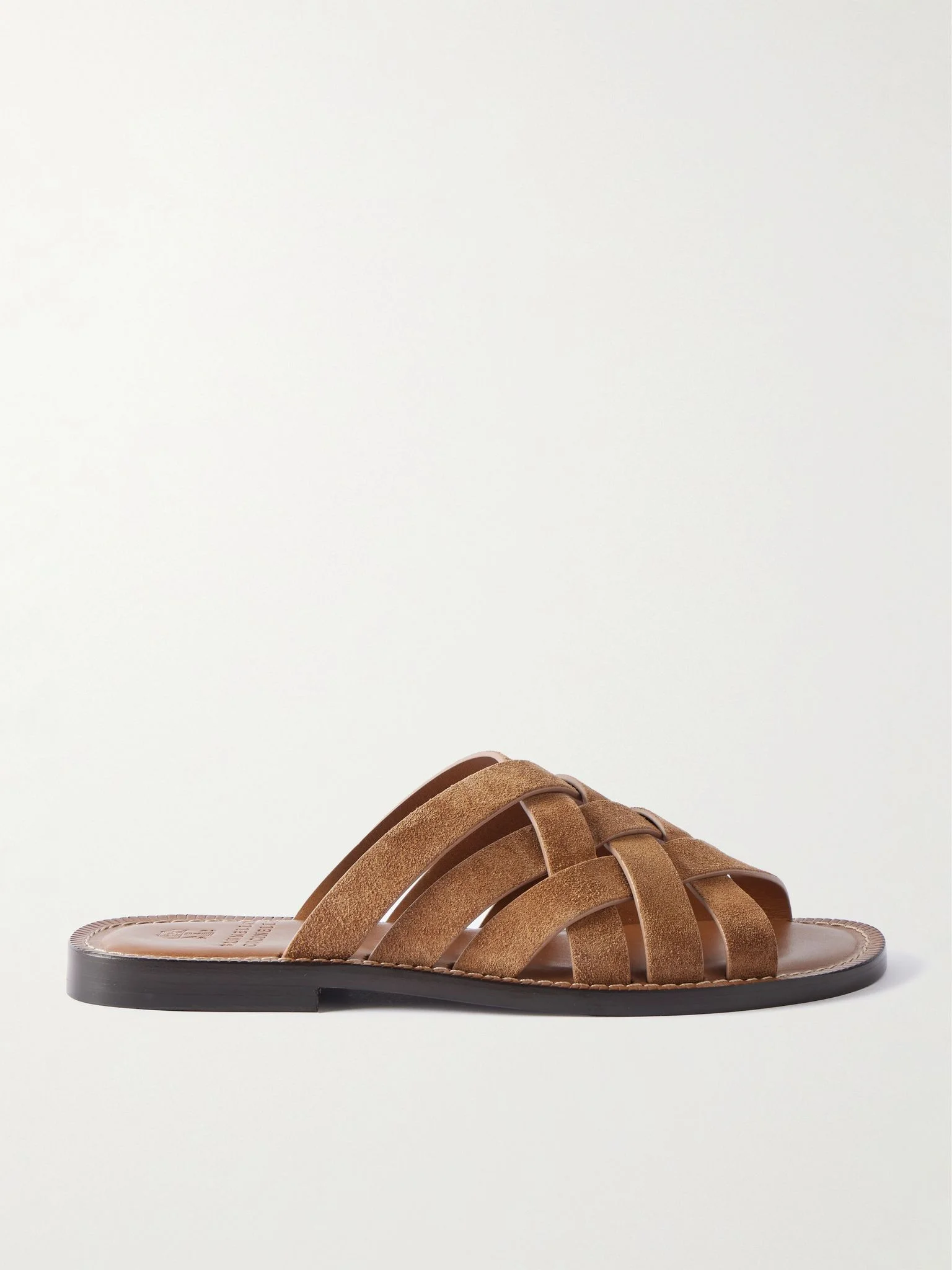 Brunello Cucinelli's sandals have woven straps that make them feel a little more put-together than your average pair. They're made from strips of suede and have a lightly cushioned insole. Size & Fit - Fits true to size. Take your normal size - European sizing Details & Care - Camel suede (Calf)
