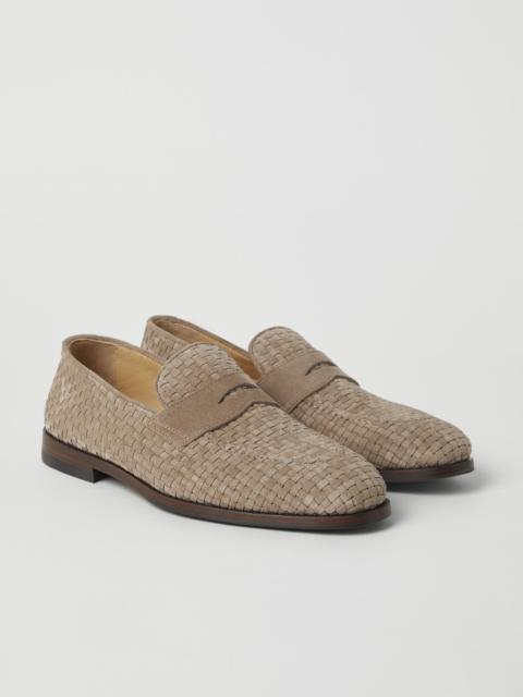 A timeless style of casual elegance, these penny loafers are enriched with refined Brunello Cucinelli materials. The velvety texture of suede is updated with a woven pattern that creates a three-dimensional effect on the leather’s surface, while the footwear’s lightweight, thin construction guarantees maximum comfort all day long. MATERIALS The lightweight suede is a refined leather with a thin, extremely soft texture. The leather lining and rubber outsole complete the footwear. DETAILS Leather lining Leather sole TPU rubber tread REAL LEATHER