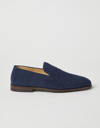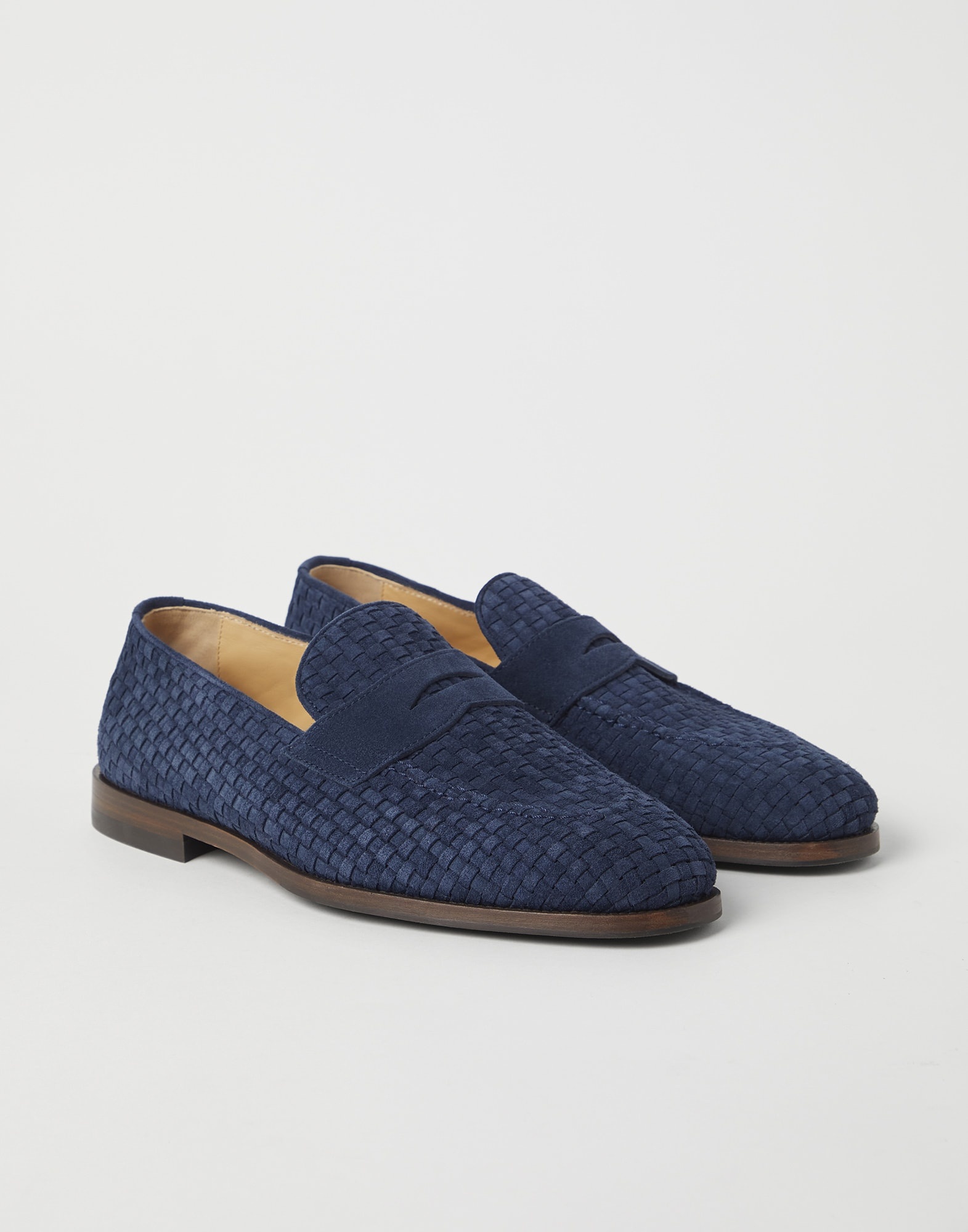 A timeless style of casual elegance, these penny loafers are enriched with refined Brunello Cucinelli materials. The velvety texture of suede is updated with a woven pattern that creates a three-dimensional effect on the leather’s surface, while the footwear’s lightweight, thin construction guarantees maximum comfort all day long. MATERIALS The lightweight suede is a refined leather with a thin, extremely soft texture. The leather lining and rubber outsole complete the footwear. DETAILS Leather lining Leather sole TPU rubber tread REAL LEATHER