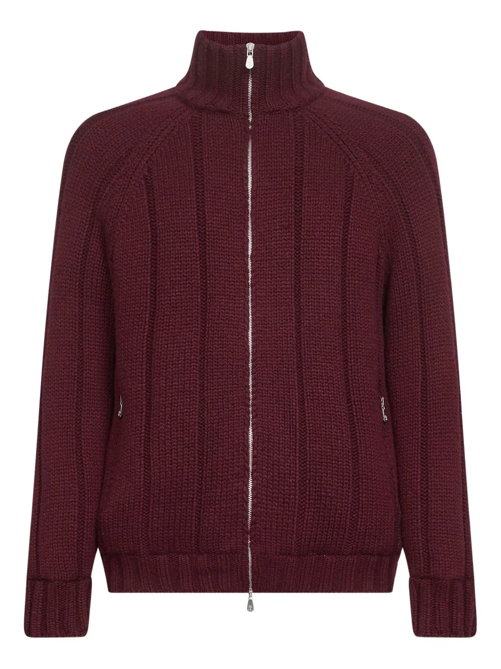 zipped high-collar sweater Highlights - Burgundy - Ribbed knit - Long-sleeves - Zipped welt pockets - Ribbed cuffs - Ribbed hem Made in Italy Composition Cashmere 100% Washing instructions Read Manufacturer Guidelines